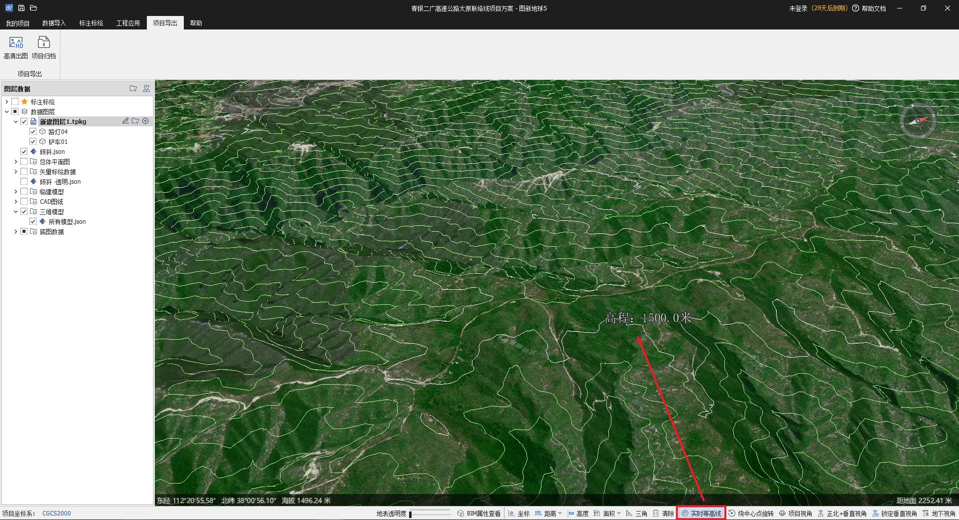 点击“实时等高线”,一键开启场景内加载地形的实时动态等高线,等高线的分布状况也可以显示出地形变化的陡峭和平缓。鼠标悬浮在等高线上,可以查看高程值,单位为米。