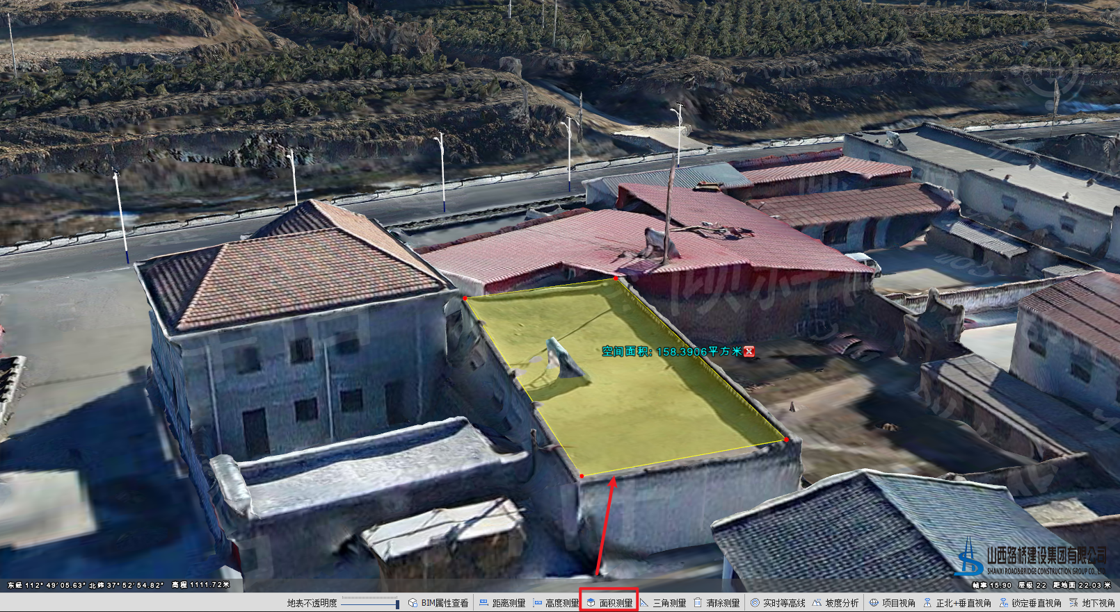 面积测量是指在场景中测量的空间面积。空间面积指的是面要素各节点构成的空间面的总面积,与各点所取的高程相关。