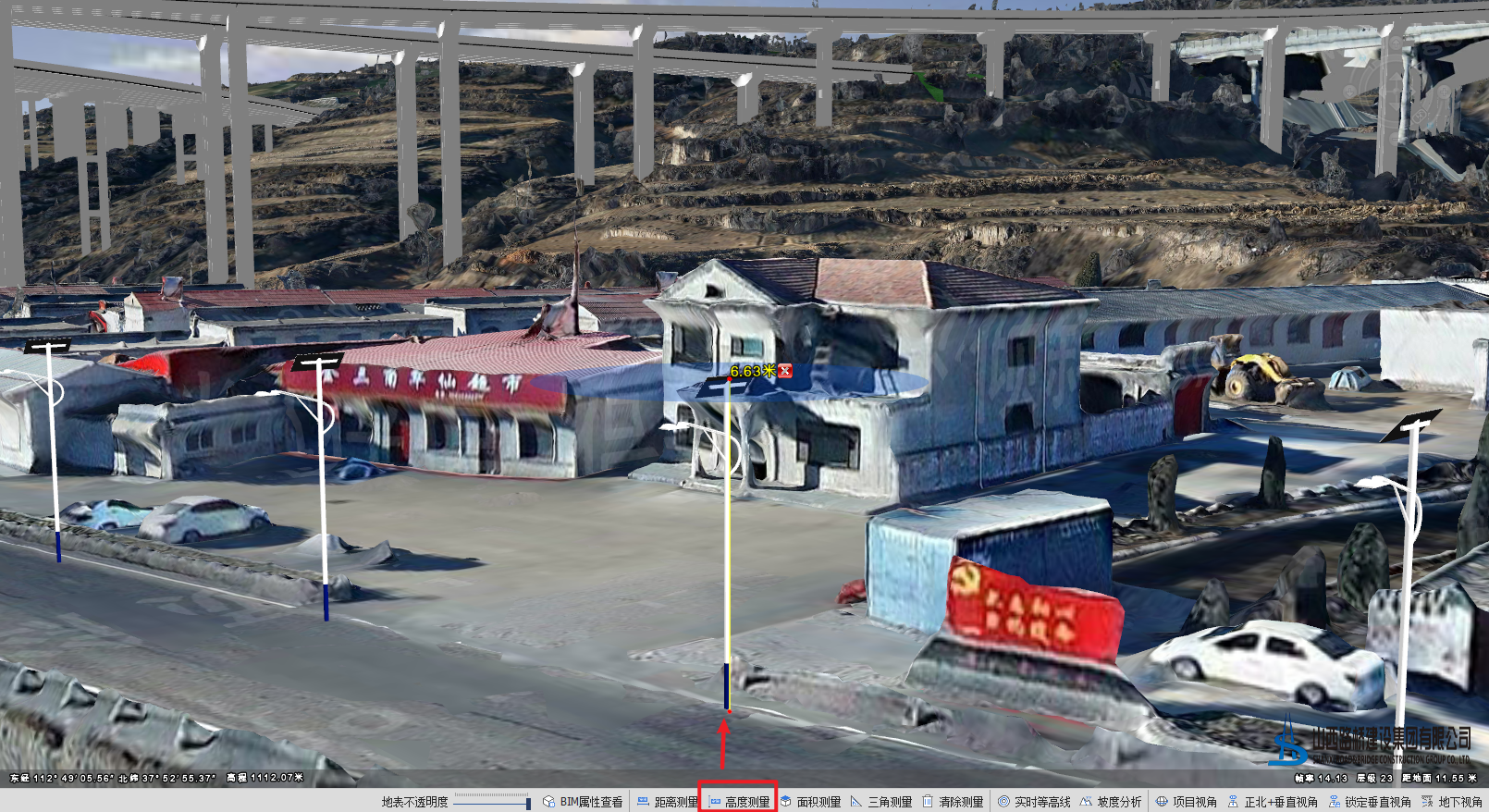 高度测量是指测量某一平面与初始平面的高度差。绘制要测量的两点,显示垂直高度差。注意:起点的高度为0,终点往上时,高度测量值为正值,终点往下时高度测量值为负值。例如,可以在点云、倾斜模型、BIM模型等三维数据上,测量电力塔、房屋、树木等模型高度。