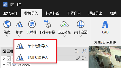 单个导入:支持tif、lrp格式的地形数据直接导入,点击“地形”功能,直接选择文件即可导入。