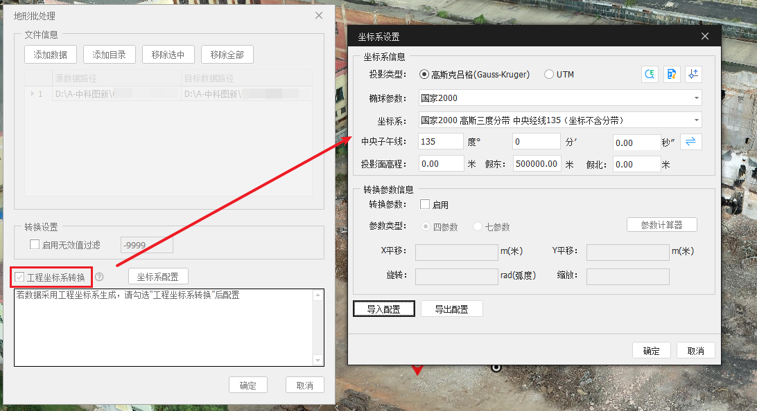 (5)工程坐标系转换:默认不勾选,勾选后,进行坐标系配置,配置完成后对列表中所有数据生效。(一般地形生成时会配置投影,如果制作时未选择投影信息,无投影的地形可通过配置工程坐标系加载到软件内)
