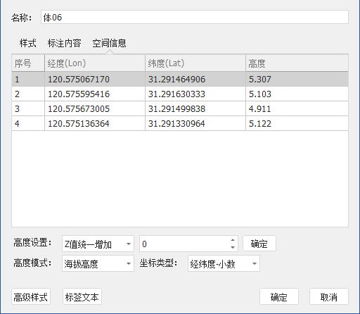空间信息:可修改标签经纬度、高度信息,标签的高度模式,高度模式默认为海拔高度;