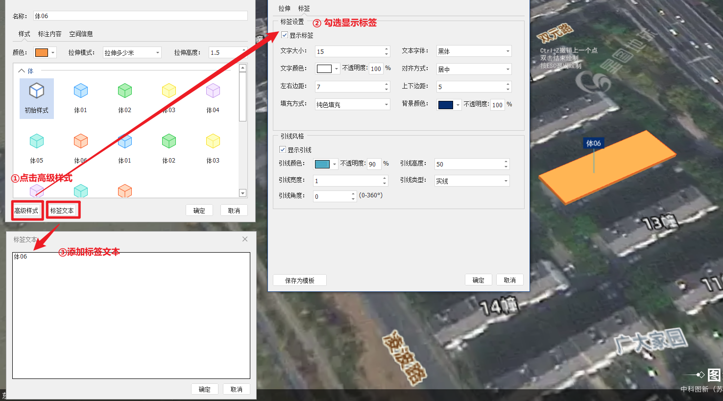样式:包括体颜色、体拉伸高度等;更细节的样式(体填充方式、填充图案等)调整,需要点击“高级样式”进行设置;