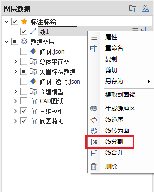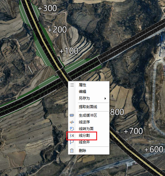 线分割是指可以用一条线对一条线进行分割,可以将一个线要素在任意位置分割为两条线。例如,某一条线路工程,需要按照桩号将总长进行分段,就可以用分割线功能将整个线路分割成多个小段线。