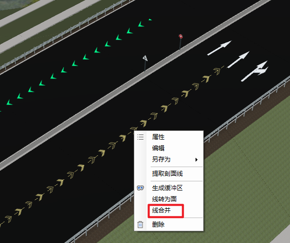 ②在地图场景中选择线要素,右键菜单 -- 线合并,以该线为主,再在场景中选择与之合并的第二根线,进行合并。