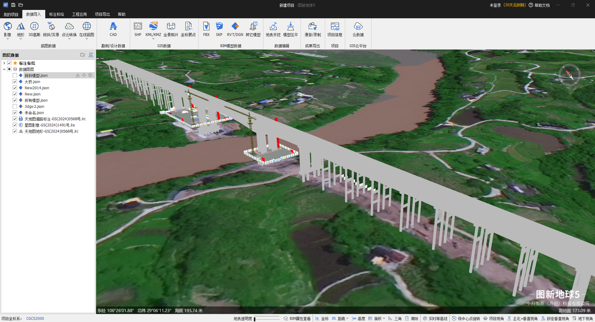 软件支持加载RVT、DGN等格式BIM模型数据,原始格式文件需要先通过插件(下载插件点这里)转换成3dtiles格式文件再加载到软件中,并且支持点击查看3dtiles格式BIM模型构件的属性信息。 以rvt格式为例,3dtiles格式BIM模型在软件内加载效果,如下图所示: