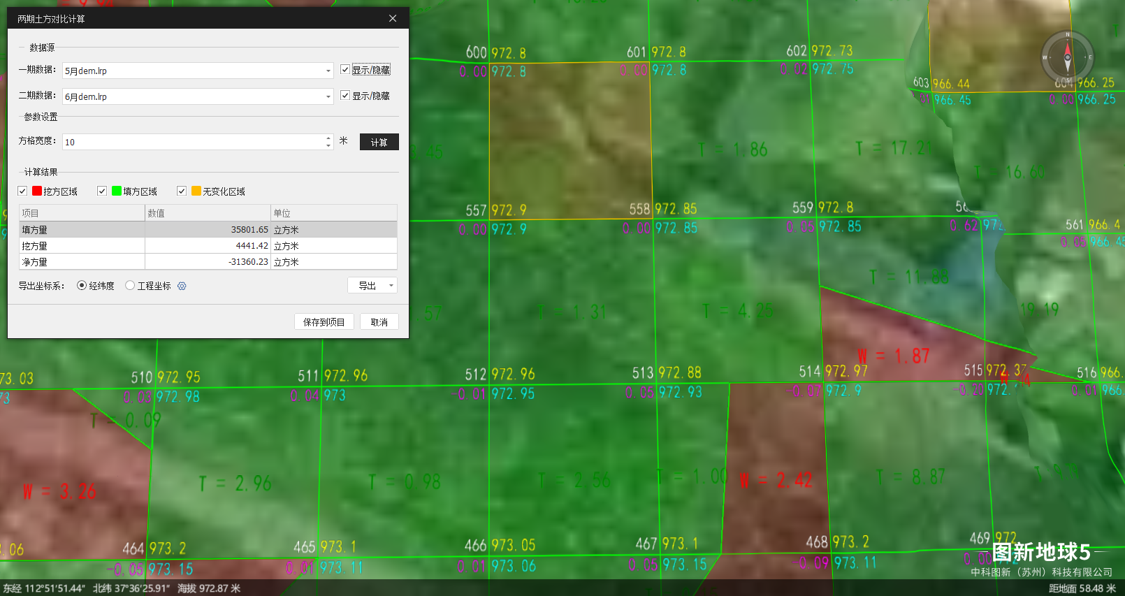 点击“计算”,计算完成后界面会显示计算结果,以及在场景中可以看见每个方格、设计高程、实际高程、高程差以及每个方格内填方、挖方量。更改计算参数后,可重新点击计算更新计算结果。
