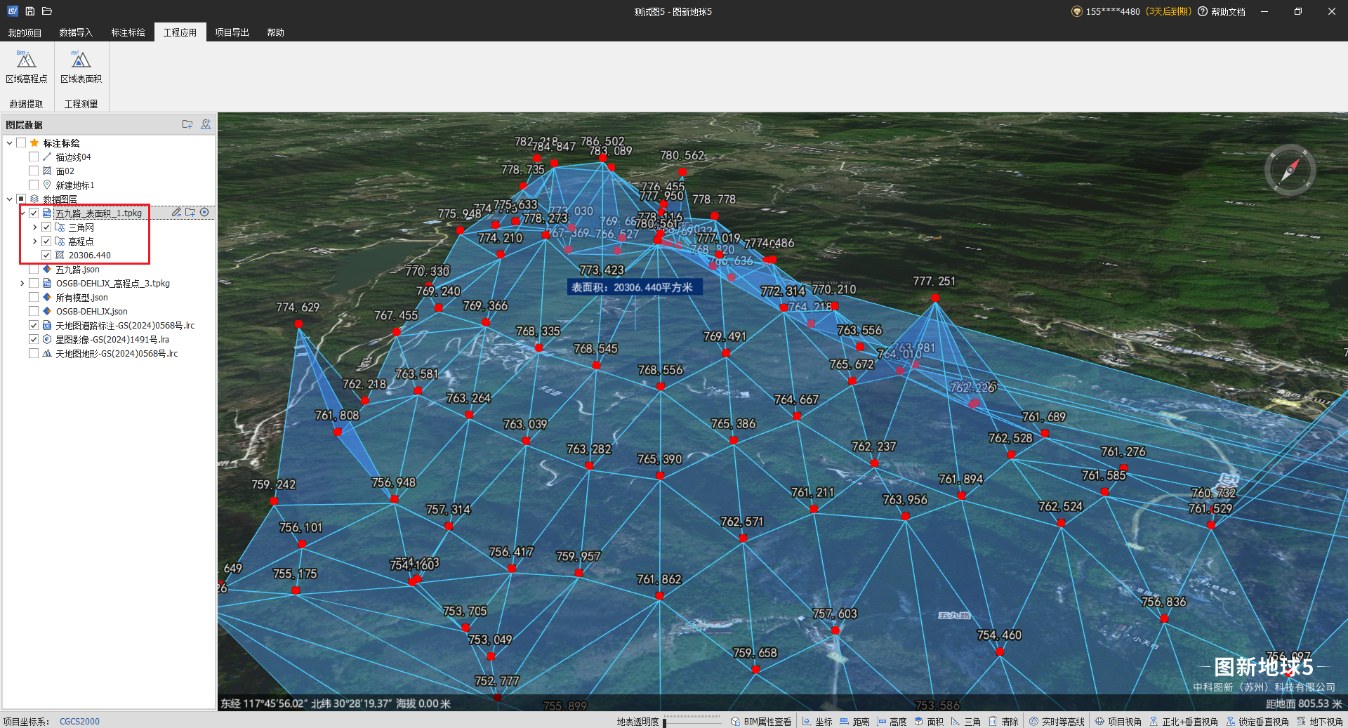 点击“保存”按钮,将当前提取的高程点、三角面结果、表面积范围面、表面积结果保存在一个tpkg矢量文件到该工程项目中,保存成功后,并自动加载到场景中。