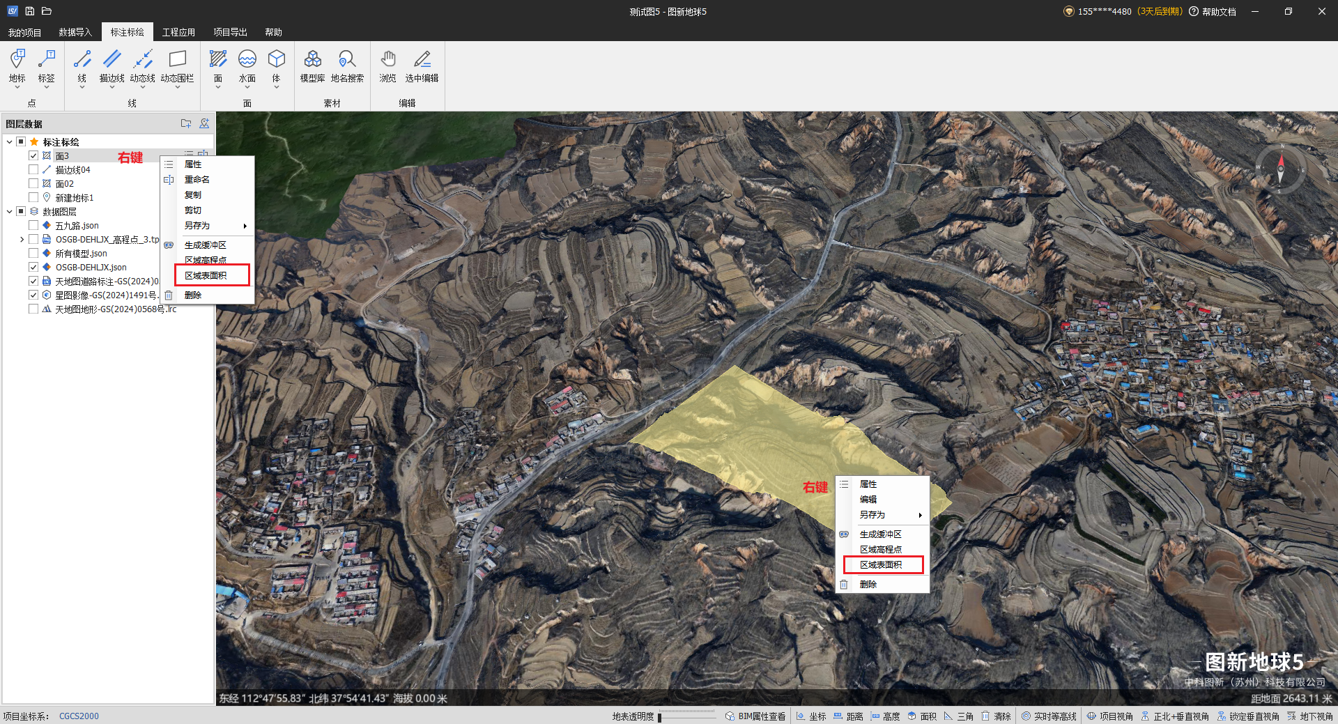 通过面计算:在场景中已有的面要素右键,选择“区域表面积”,按照该面范围进行计算。