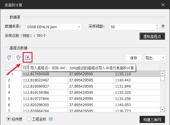 (2)导入高程点:点击,通过导入文件形式导入已有高程点,支持dat、tpkg格式导入。