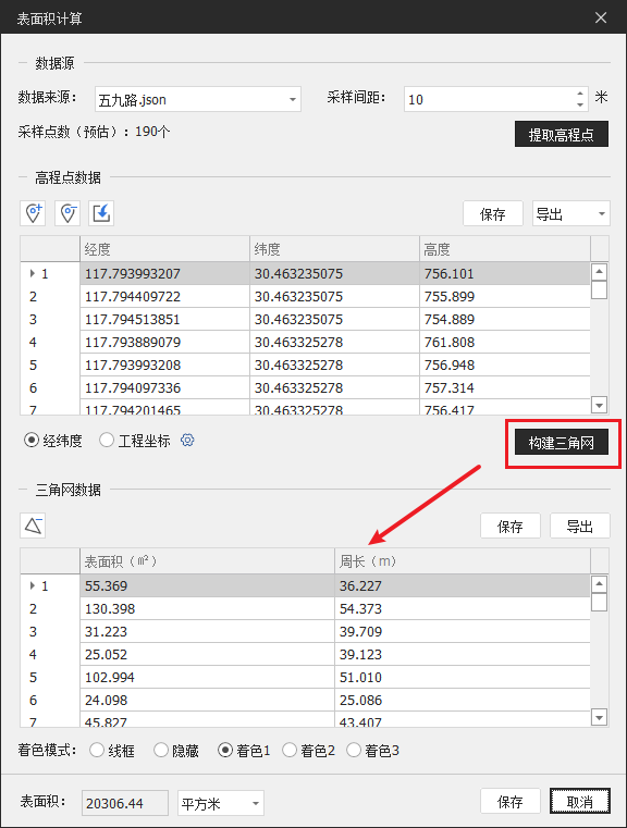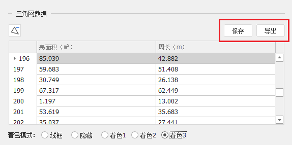 导出: 点击“导出”,将所有三角面表面积、周长另存为一个excel文件。