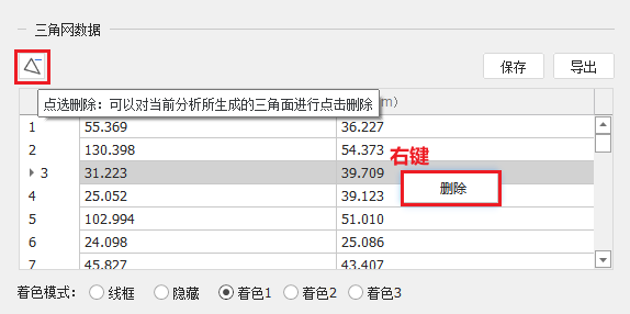 三角网构建完成后,可以用 工具在场景中连续删除三角面,或在表格中可右键删除整行数据,并且场景中会删除对应三角面。