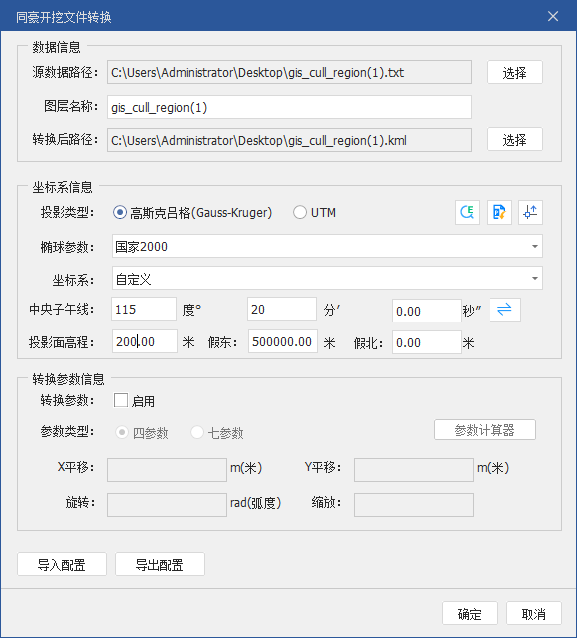 (2)选择同豪txt格式的开挖文件,配置好对应的坐标系信息(椭球参数、坐标系),并且支持自定义中央经线、投影高、四七参数的文件转换。点击“确定”自动处理为KML格式文件。