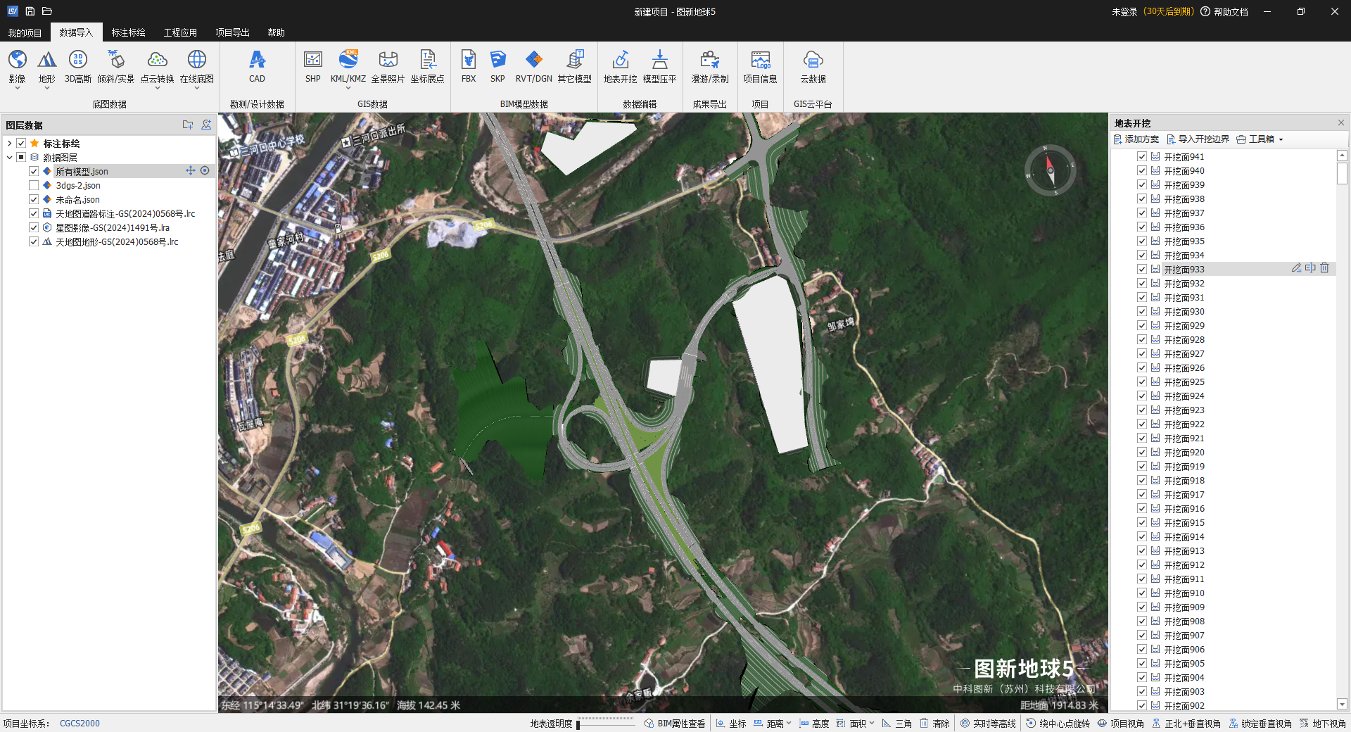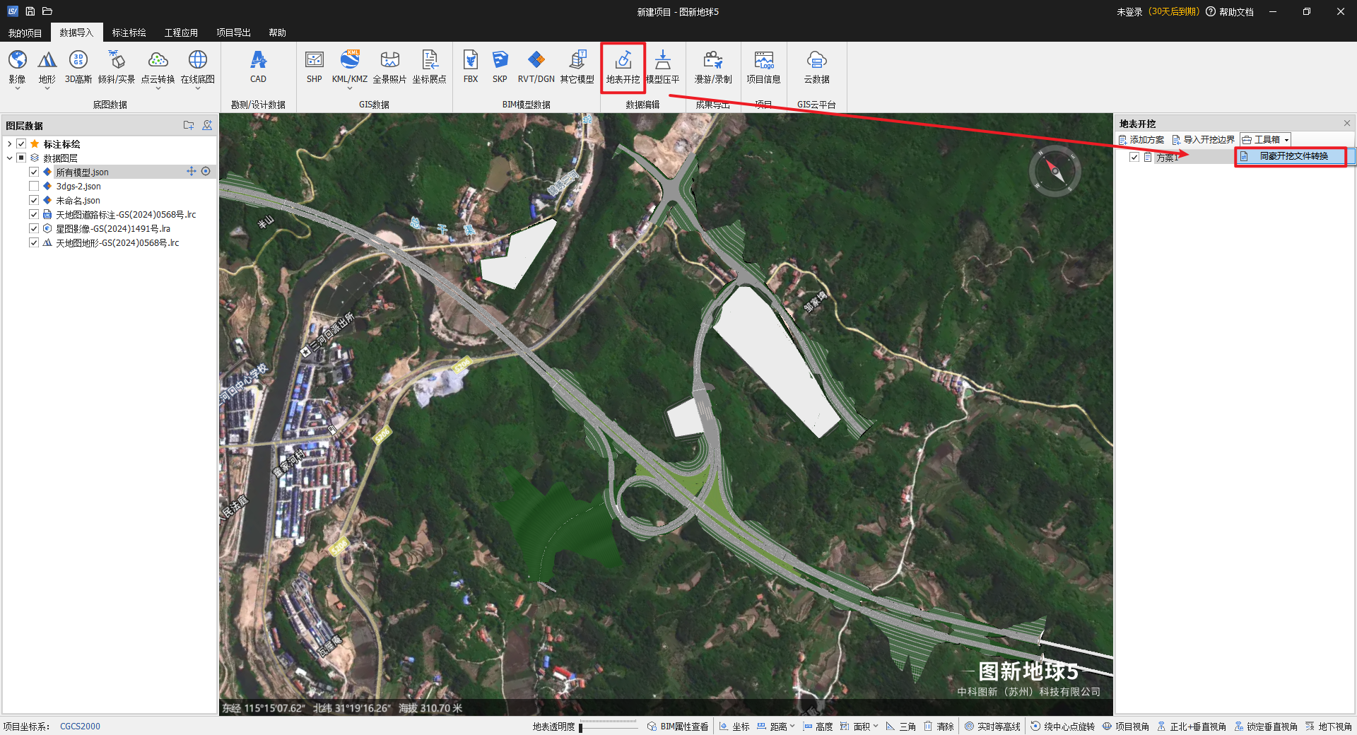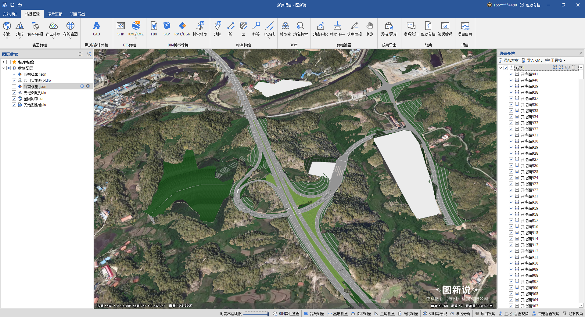 同豪设计的三维成果包括 BIM模型、tif地形和开挖边界数据,将这三种成果分别从同豪导出再导入图新地球,结合底图进行展示汇报。