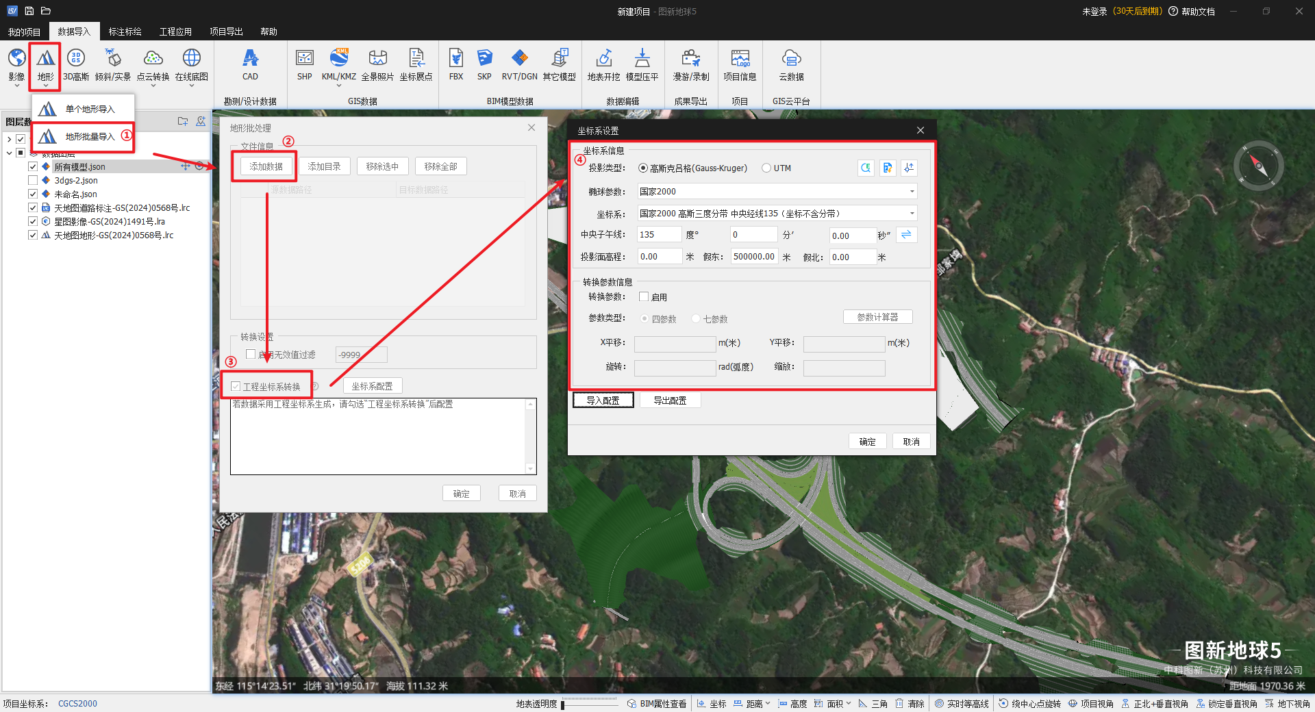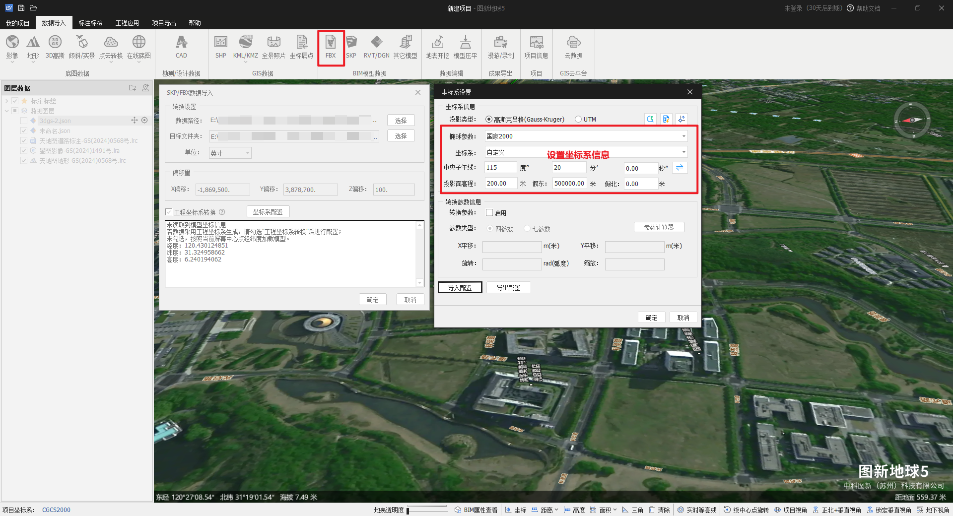 同豪导出tif格式的开挖后地形,本身是不带有投影信息,需要按照下图配置工程坐标系,将开挖后地形数据导入到软件内。