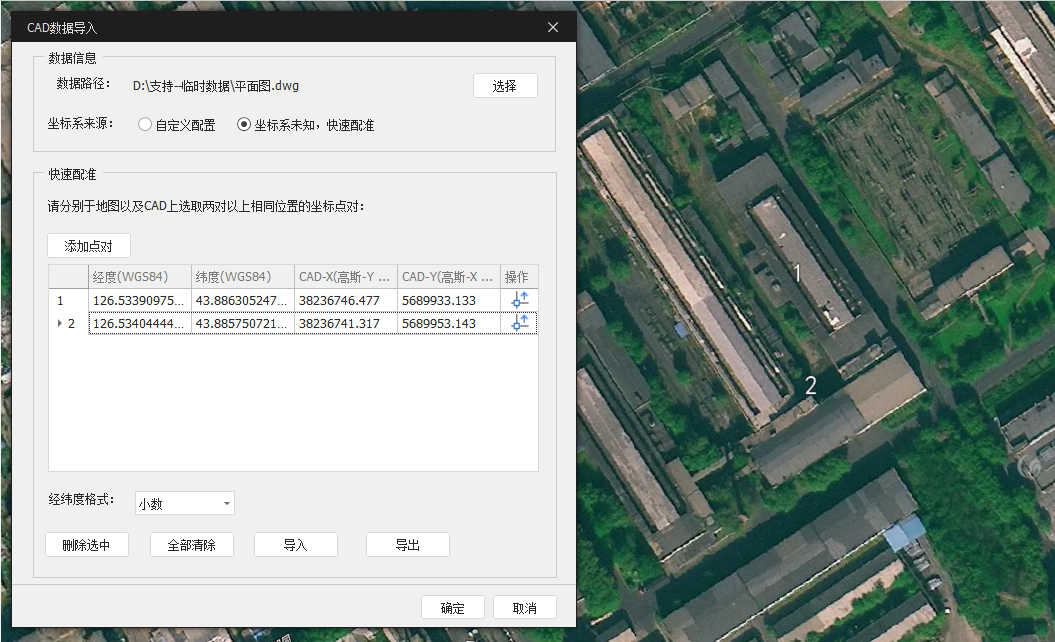 快速配准的方式作为导入CAD数据的补充,并不是精确的坐标转换,选择的点分布越均匀、点位越准确,匹配效果越好。