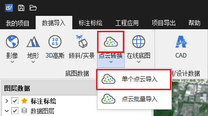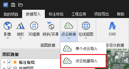 点击点云转换下面箭头展开,再点击“点云批量导入”,选择一个或多个las格式点云文件。