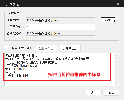 如果需要按照其他坐标系导入,需要勾选“工程坐标系转换”进行配置(不会改变数据本身的投影信息)。