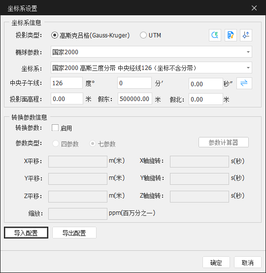 如果已知数据的工程坐标系,可以勾选“工程坐标系转换”进行配置坐标系、四七参等信息。