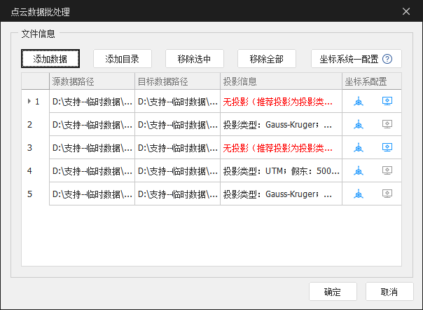 - 坐标系统一配置:为列表中所有无投影的数据统一配置工程坐标系。