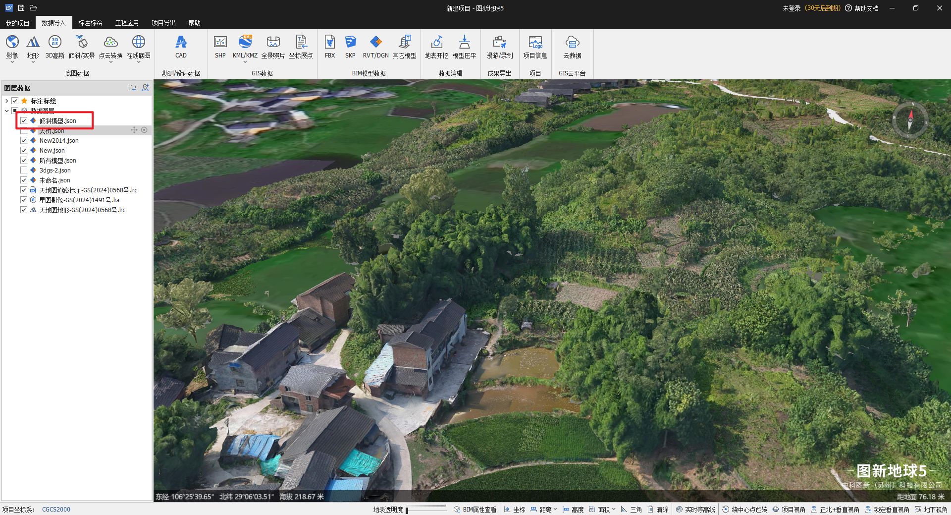 1、首先场景中需要已经加载一份或多份OSGB格式的倾斜模型数据,在场景中能看到,并且左侧图层列表中显示json格式数据。