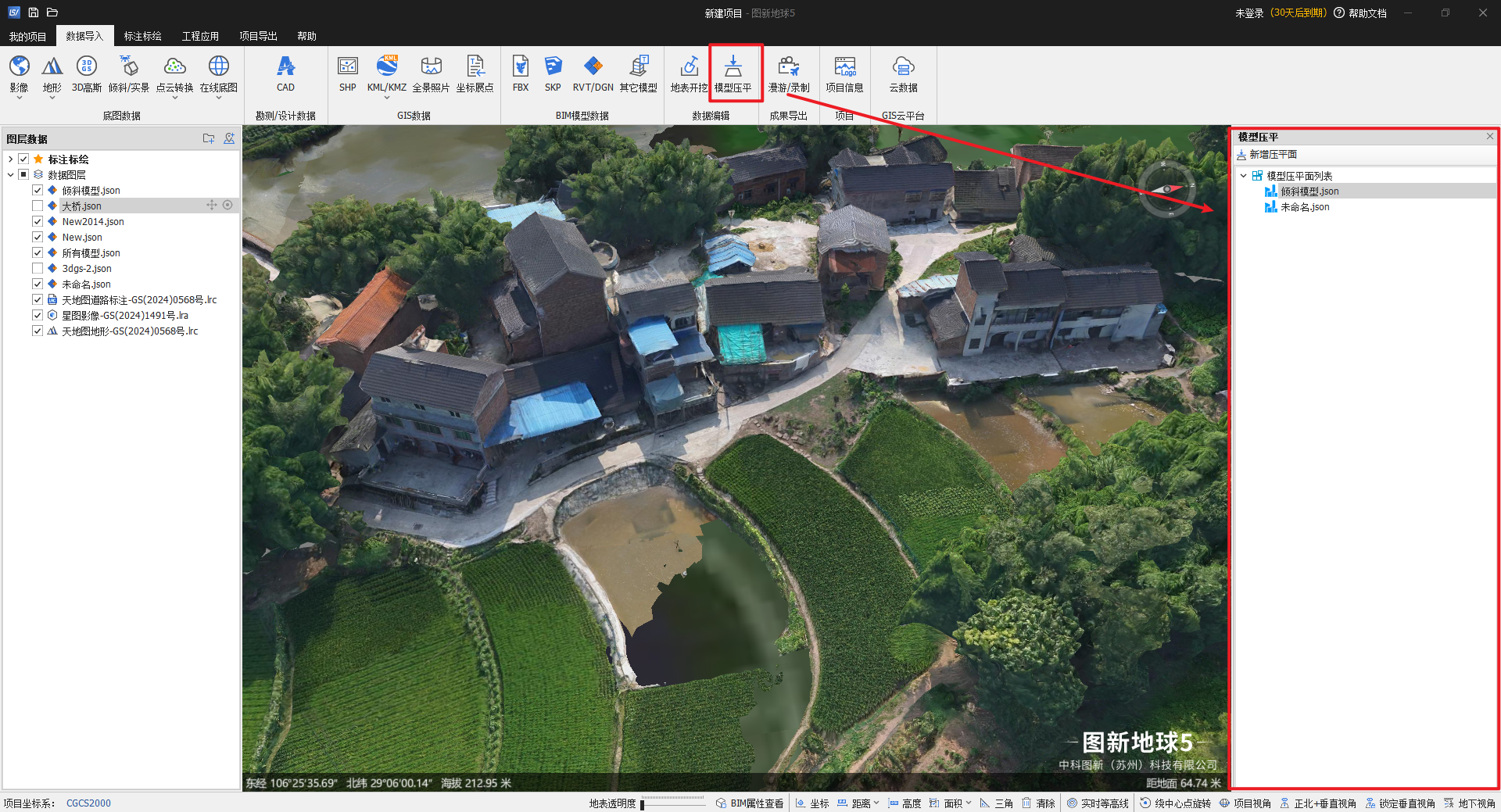 倾斜模型压平功能是为了更好的将BIM模型和实景三维相结合,可以在压平的区域放上BIM模型进行融合展示。