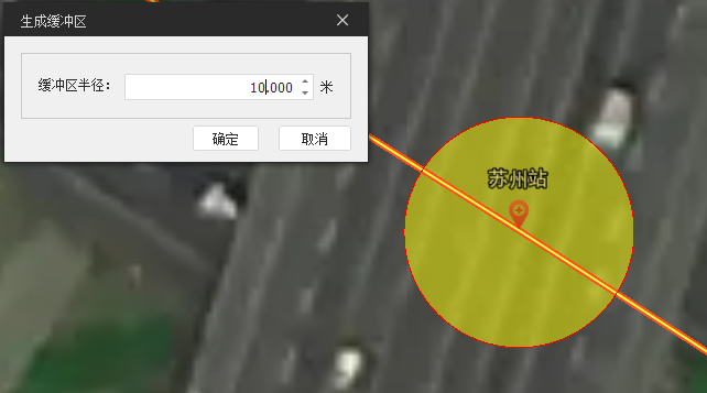 弹出缓冲区设置界面,可以设置缓冲区的半径(单位米)、拐角是否圆滑,两端是否圆滑,修改参数时场景内效果实时变化;