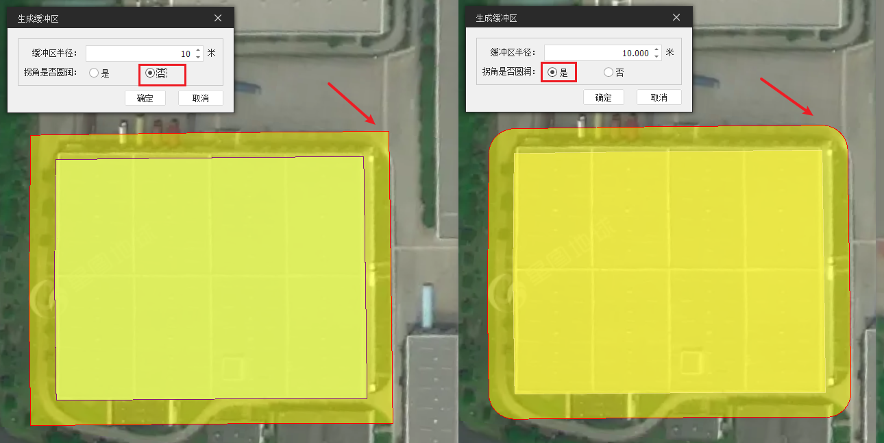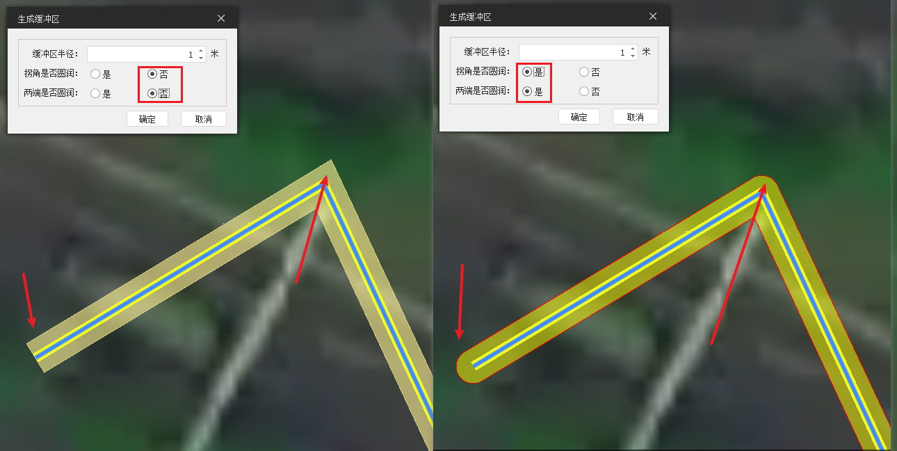 线:生成缓冲区设置半径、两端是否圆滑、拐点是否圆滑。