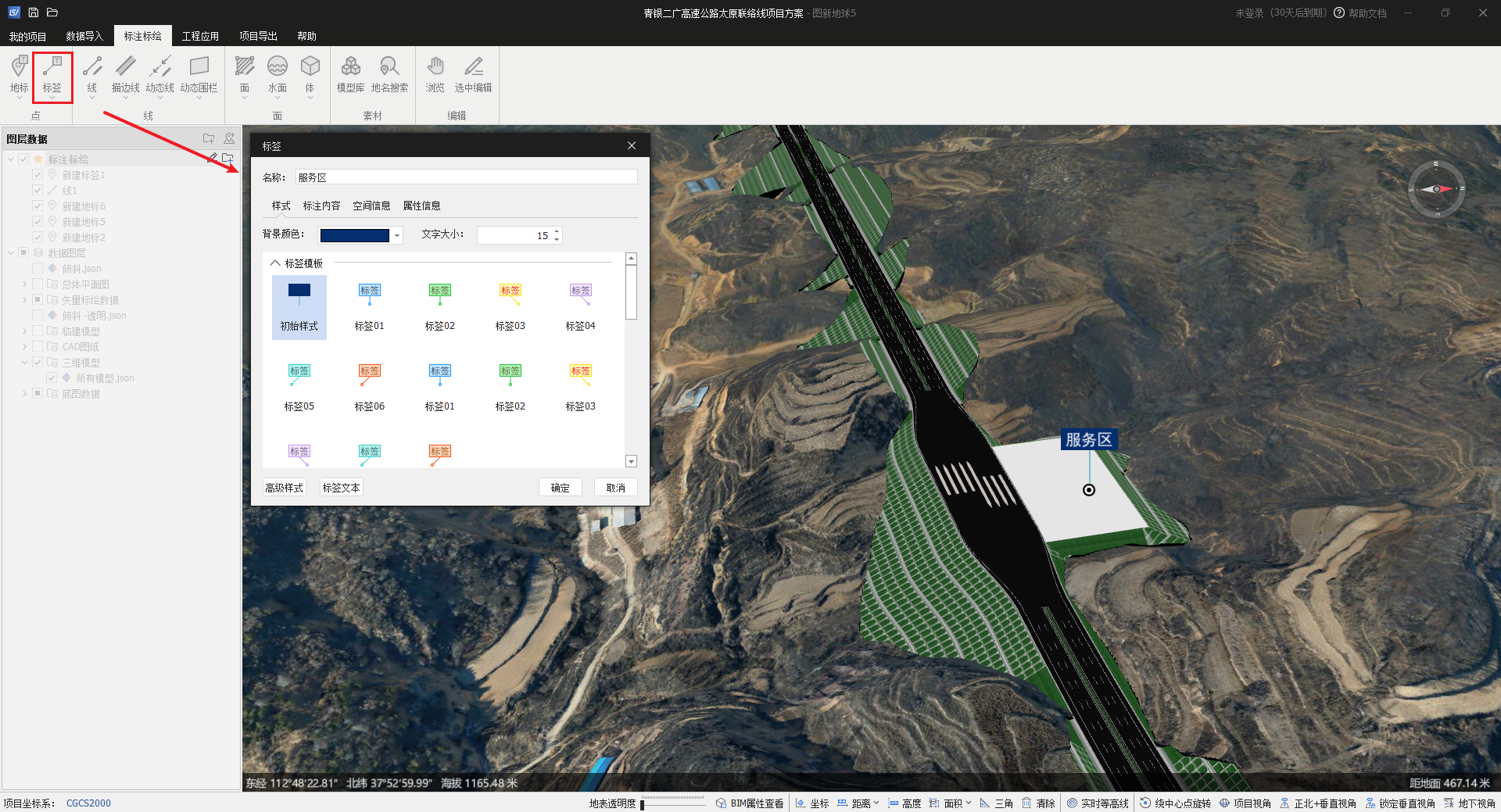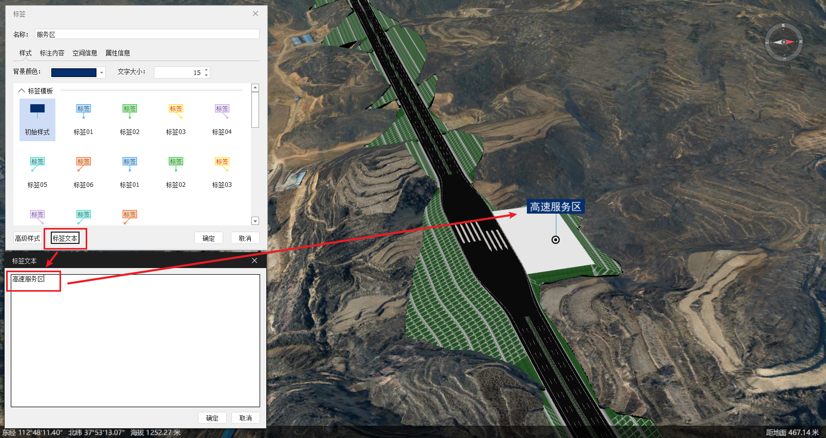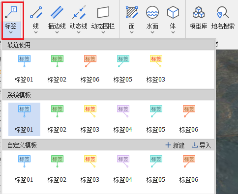 标签主要是用于在地图上添加一个标签显示重要标识。例如,在制作汇报场景中,添加多个标签展示不同建筑、位置,还可以在标签中插入图片,显示当前位置采集的现场照片等。