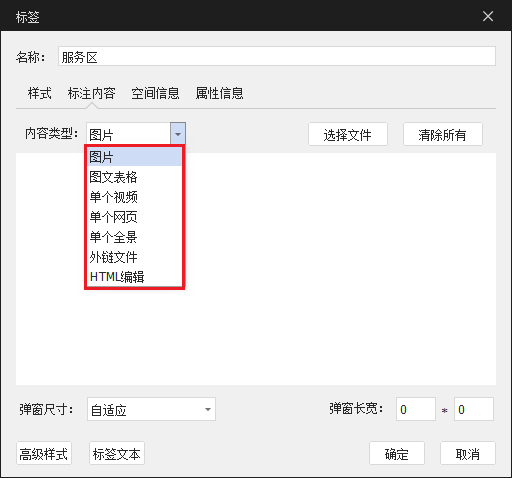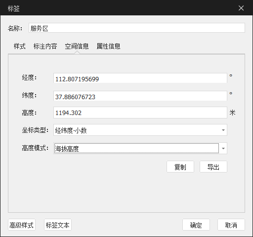 空间信息:可修改标签经纬度、高度信息,标签的高度模式,高度模式默认为海拔高度;