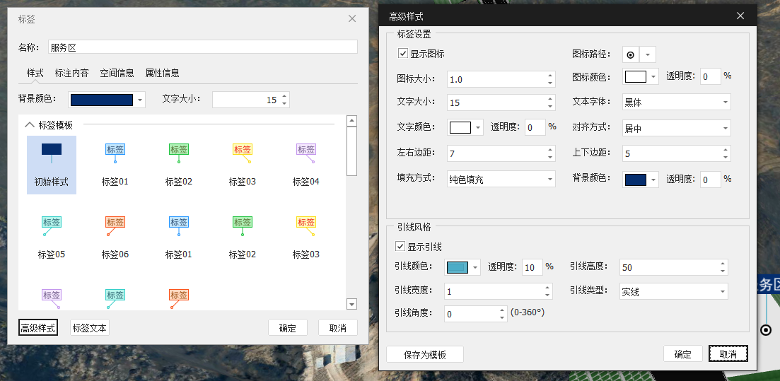 样式:包括标签背景颜色、文字大小等;更细节的样式(引线角度、标签图片背景填充等)调整,需要点击“高级样式”进行设置;