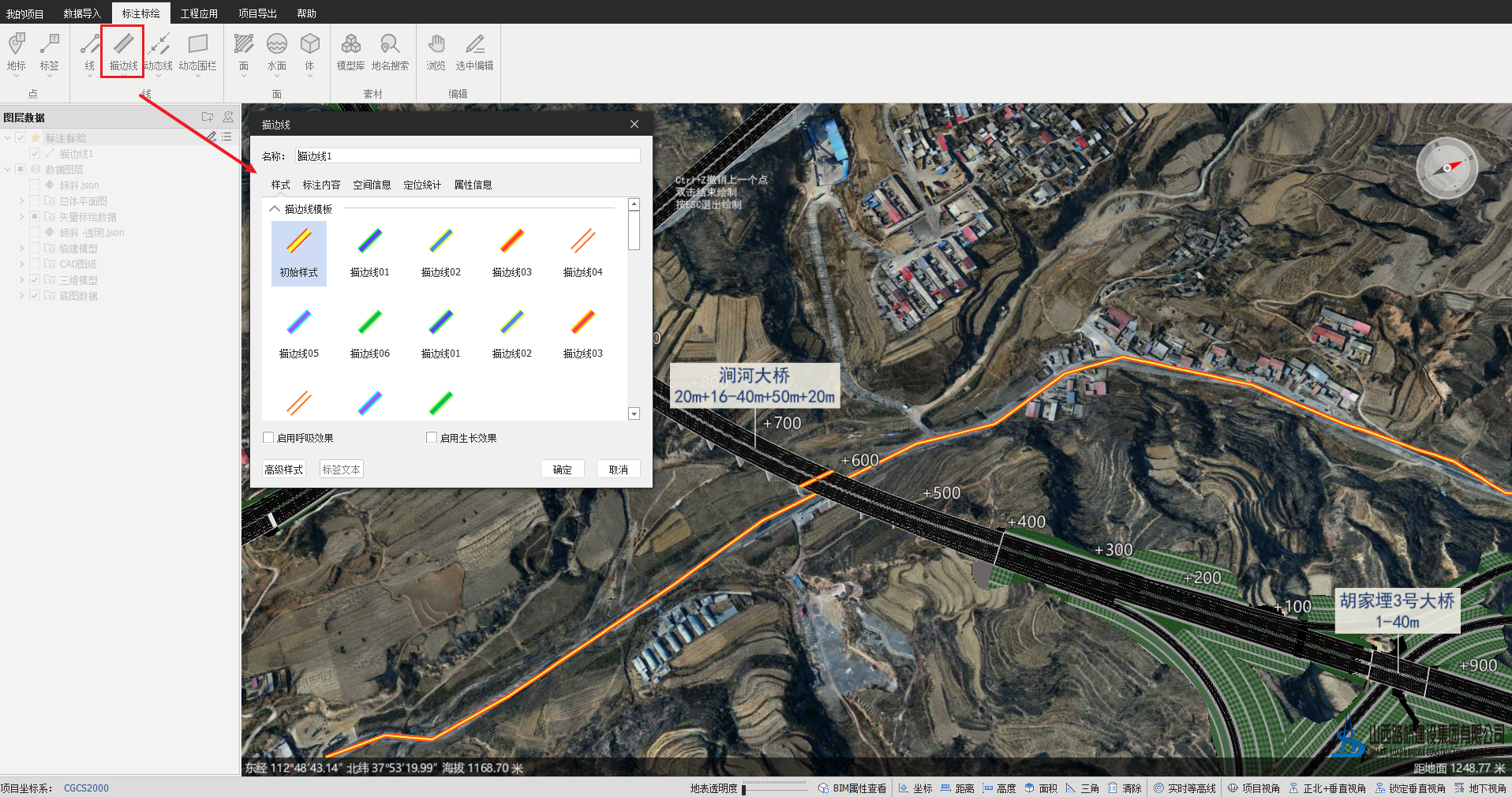 名称:描边线在左侧图层栏显示的名称,如果在高级样式勾选“显示标签”,场景中该线中心点显示该名称的标签,也可以点击“标签文本”更改显示内容,则显示标签文本内容;