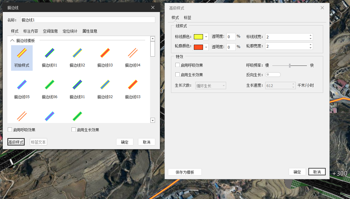 ⭕选择默认样式或者模板进行标绘时,修改样式、名称等信息只会修改当前单条描边线,不对后续绘制的描边线造成影响。