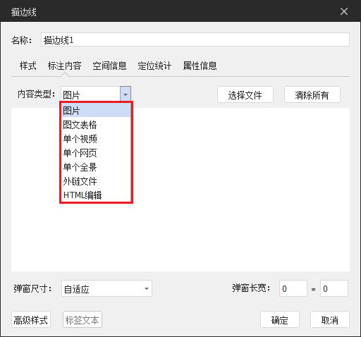 标注内容:可添加图片、视频、全景、图文表格、网页、外链文件、HTML编辑,添加完成后在场景中点击标签可弹出;