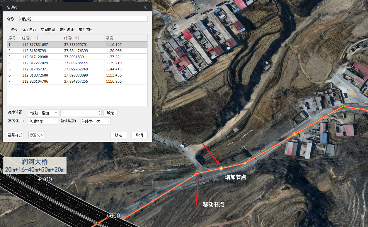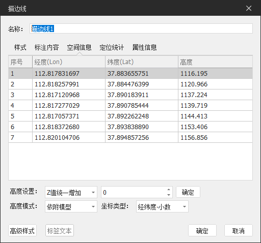 空间信息:可修改描边线各个节点的经纬度、高度信息以及面的高度模式,高度模式默认为依附模型;