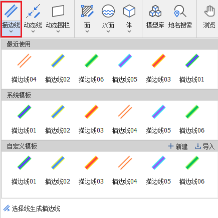 (1)点击“描边线”功能下方按钮,展开模板列表。