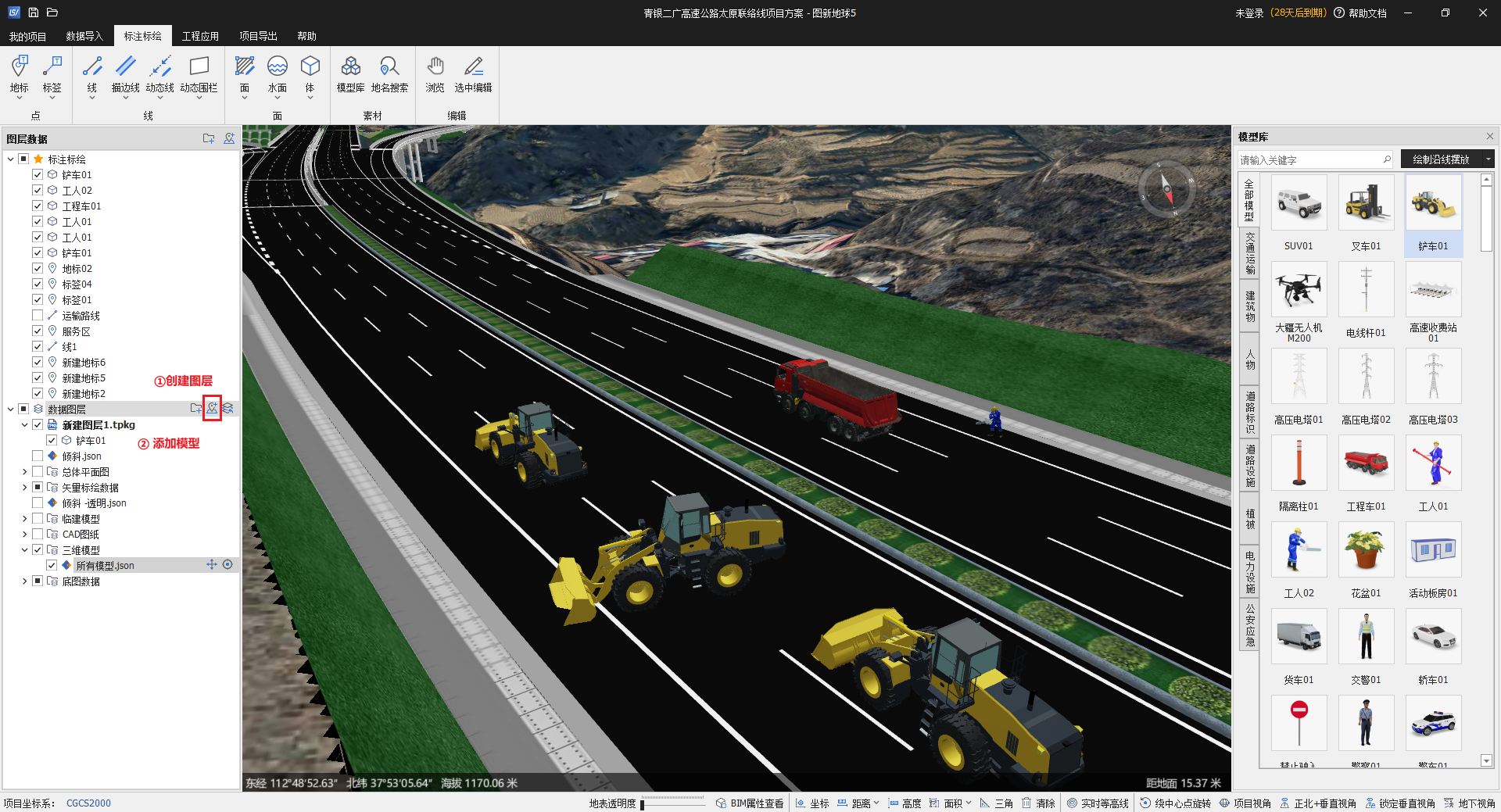 (1)创建图层 模型需要加载到矢量图层内,可通过图层栏创建一个TPKG图层。如果左侧图层数据中没有矢量图层或没有正在编辑的矢量图层,模型将自动添加到“标注标绘”图层中。