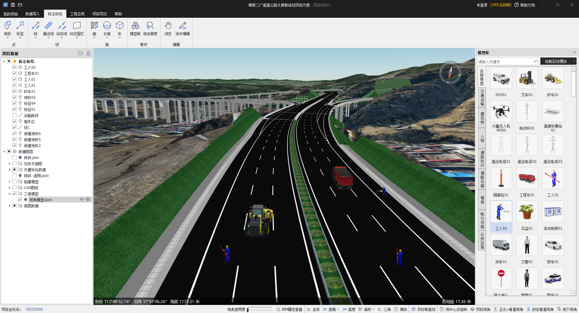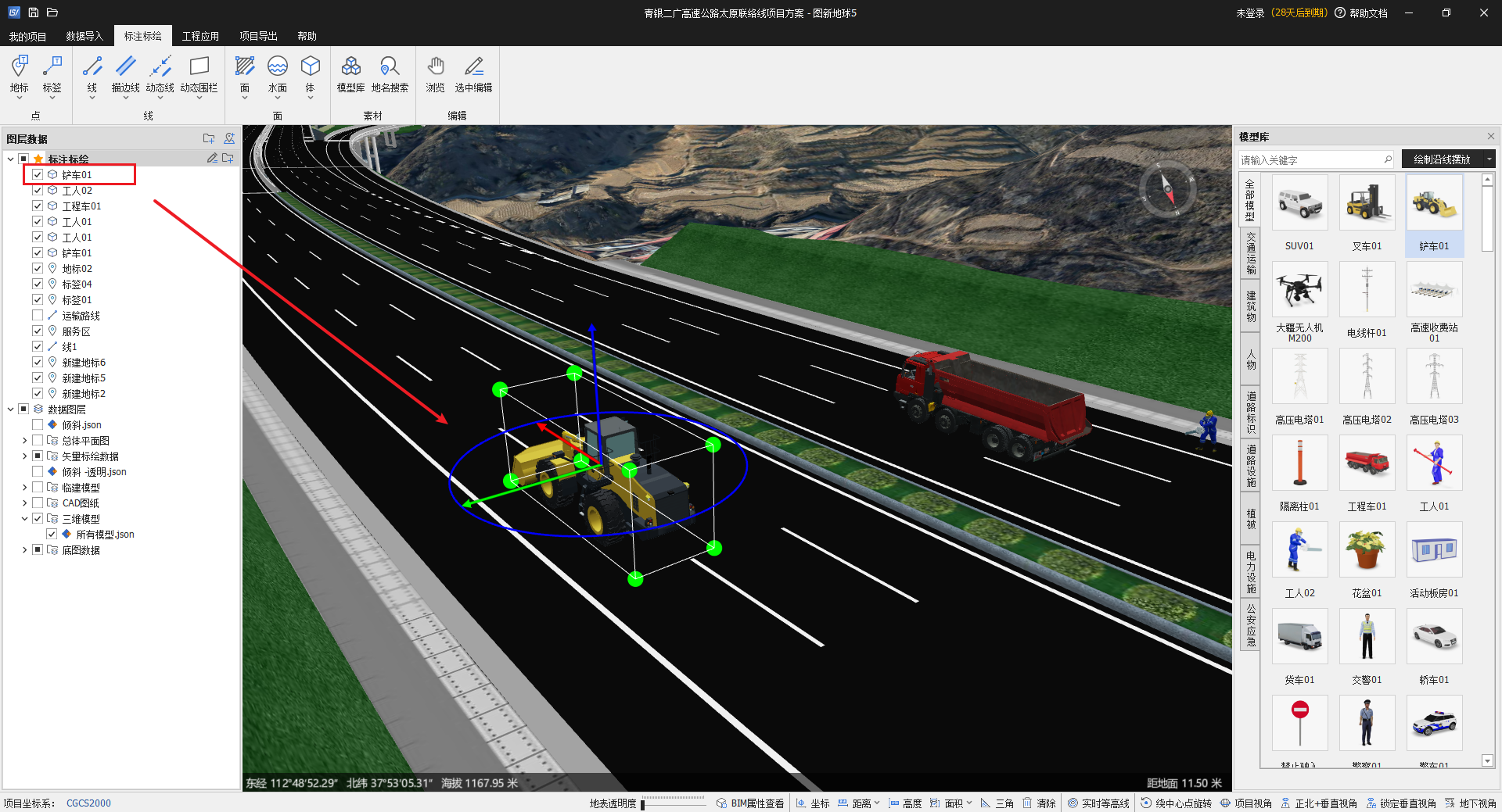 在右侧模型库中,点击需要添加到场景内的模型,再点击模型放置的位置,模型是自动捕捉地形、倾斜模型、BIM模型上进行放置。放置完成后可随即通过三轴和角点进行平移和缩放模型操作。