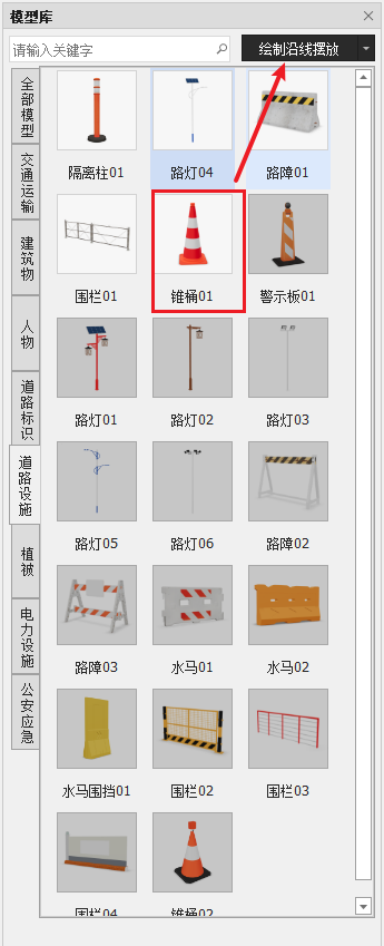 模型库内有多种类型模型,支持搭建场布、临时场景等。在现有模型库模型基础上,支持模型库内的模型沿线摆放,例如,按照施工范围摆放围栏、按照公路路线以一定间距摆放路灯等。