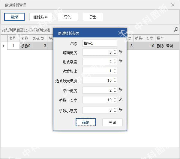 预设便道模板,包含路面、边坡、平台、桥等相关基础参数,支持模板自定义修改,为标准化设计提供基础支撑。