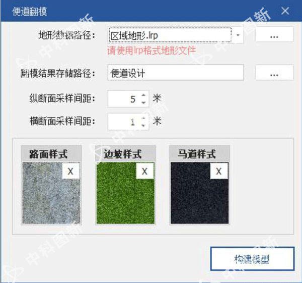 支持设置纵断面/横断面采样间距,自定义路面、边坡及马道样式,自动生成便道三维模型,直观呈现设计效果。