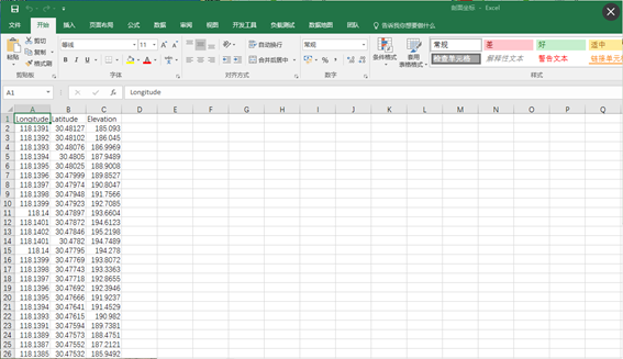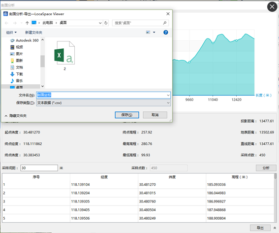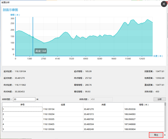 可以看到这些坐标,是按上面30m间距采样的经纬度和海拔。点击导出按钮。
