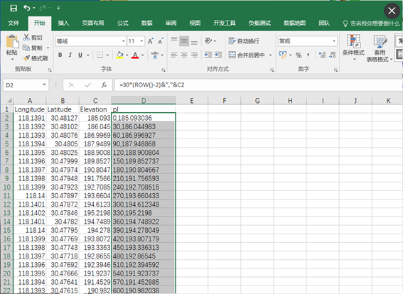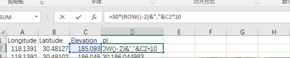 ROW()返回的是Excel单元格的行号。用30乘以行号-2,获得一个从0开始,按30递增的数列,这个就是我们的X坐标。因为两个坐标点的间距(前文的采样间距)设置的是30m。