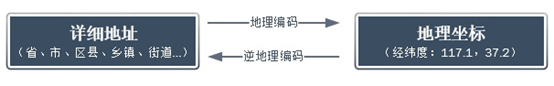 将地址信息映射为地理坐标的过程称之为地理编码;将地理坐标转换为地址信息的过程称之为逆地理编码。