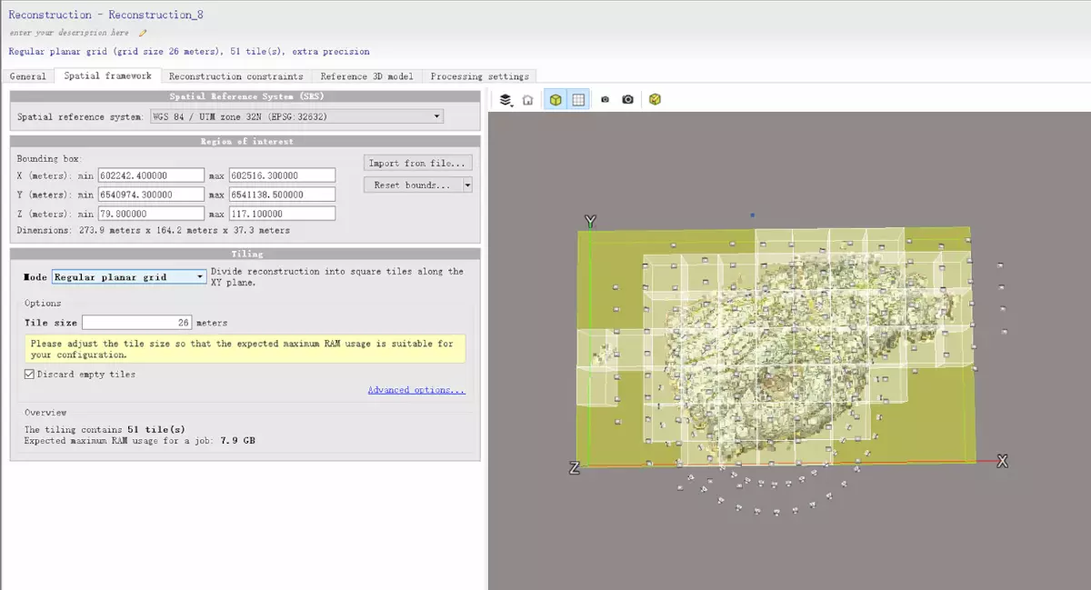 Regular planer grid:平面切割模式,把数据在xy平面切分成大小一致的多个矩形(tiles),内存只需要满足单矩形大小即可,数据会一块块生成。适合平原及一般的建筑物。设置合适的分块大小即可