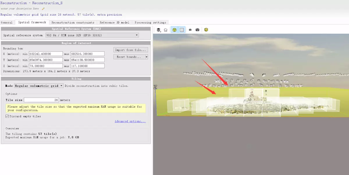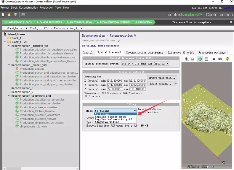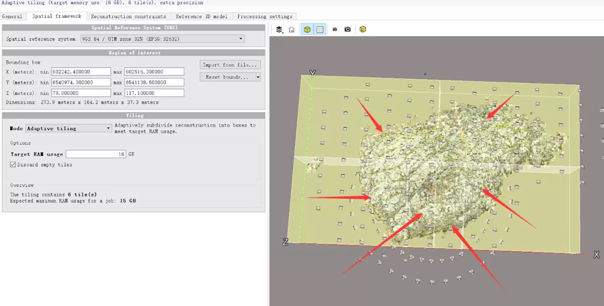 adaptive tiling:平面自适应切割模式,数据在xy平面切分成大小不一致的多个矩形(tiles),需要设置最大内存,smart3d会自动根据分配的内存,调整矩形的大小。适合数据精度有差异(高低空结合)、地面差异大(草地、房屋区分明显)。根据自己的电脑配置分配内存即可。