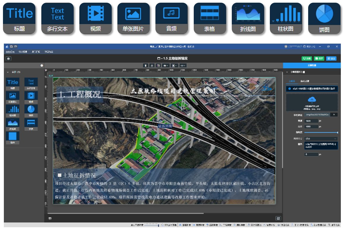 - PPT内容灵活制作:自由添加文本、图片、视频、音频、表格、图表,与三维场景同屏展示,无需切换界面。