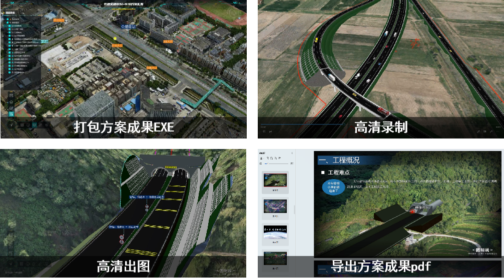 - 公路/铁路设计方案汇报:融合线路BIM模型、实景模型、地形、CAD设计图,立体展示平纵横设计与地物关系,优化选线和结构物布设。