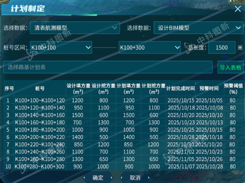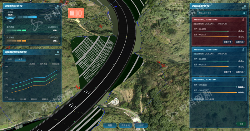 - 进度可视化追踪:以时间轴形式展示各标段月度土方完成情况,支持与设计模型叠加比对,直观呈现路基成型进度(如“已施工”“在建”“未施工”区域用不同颜色标识)。