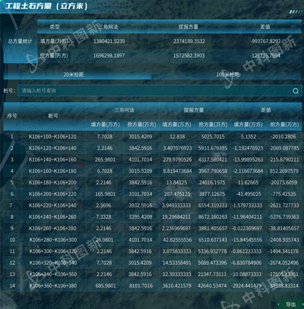 - 自动化土方核算:基于无人机月度航测生成的DEM,自动计算挖方量、填方量及净方量,支持按标段、施工区域、桩号划分统计,生成符合工程规范的土方量表。